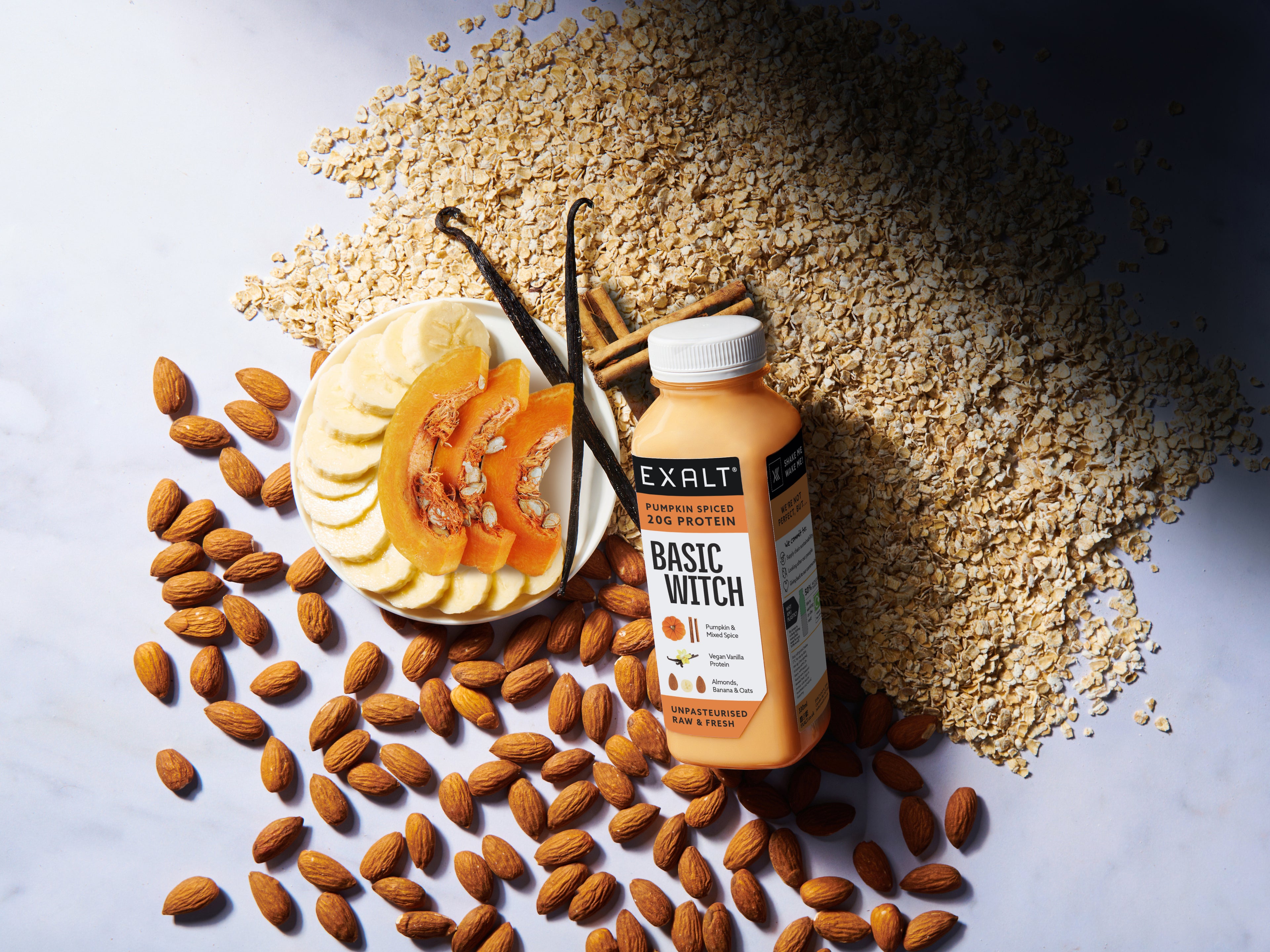 Made with EXALT Organic Madagascan vanilla vegan protein and blended with pumpkin, banana, almond butter, and autumn spice blend.