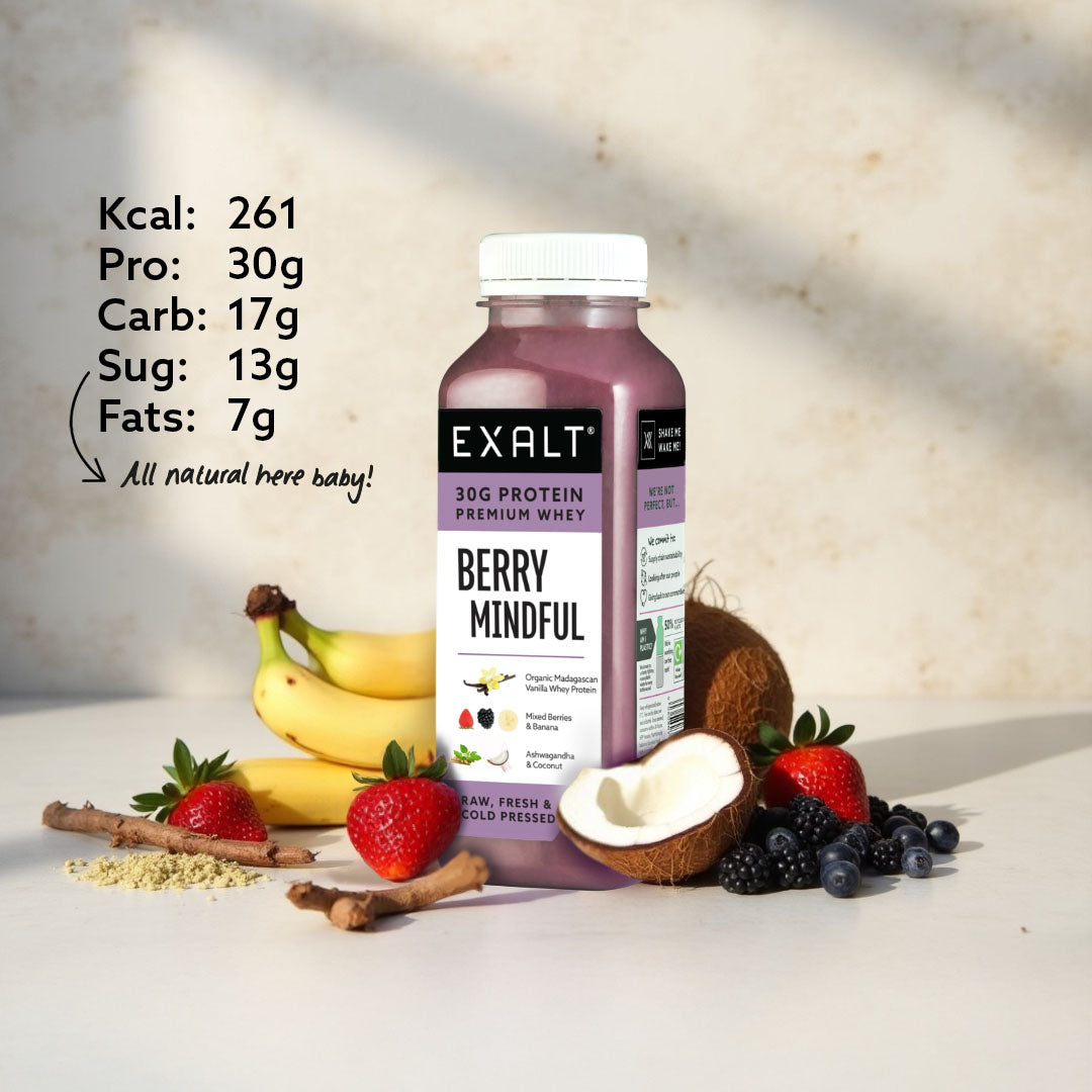 Blended with juicy berries, creamy banana, and dreamy coconut, it delivers a powerful 30g of EXALT Triple-Release Whey Protein with organic Madagascan vanilla. Oh, and did we mention the Ashwagandha? The ancient adaptogen that brings the Zen without the crash? Yeah, sheās in there too.